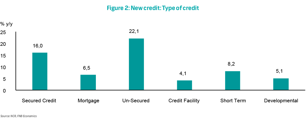 In contrast, unsecured loans surged 22.1% y/y to R27.5 billion (17.6%), with longer repayment terms becoming more common, a sign of recovery following a period of elevated defaults. Credit facilities, including credit cards and store accounts, grew modestly (+4.1% y/y) to R24.5 billion, with store cards dominating due to their accessibility. Short-term credit rose 8.2% y/y to R3.3 billion, with an average agreement size of R3 000, reflecting broader access and possible cash flow constraints among lower-income segments. Meanwhile, developmental credit, such as student and small business loans, edged up 5.1% y/y to R469 million, though quarterly volatility persists.