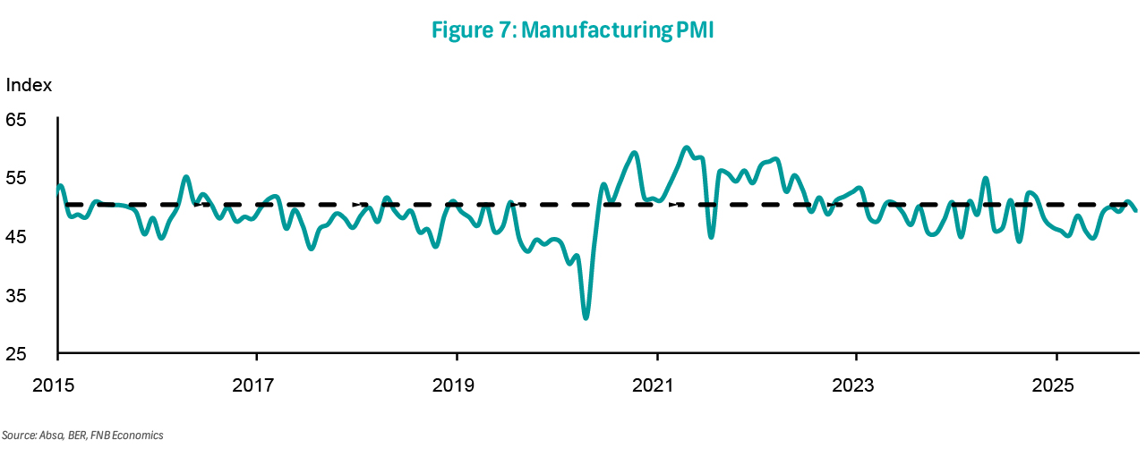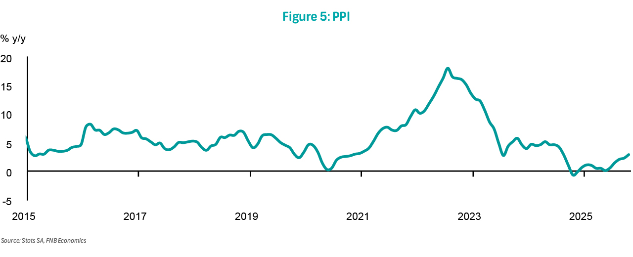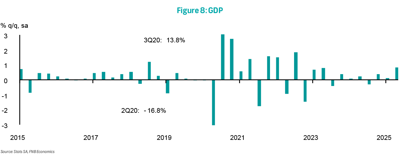 On Tuesday, the 3Q25 Gross Domestic Product (GDP) data will be released. Real GDP grew by 0.6% y/y in 2Q25, following gains of 0.8% y/y in both 1Q25 and 4Q24. On a seasonally adjusted basis, the economy expanded by 0.8% q/q. Growth was broad-based, with mining, manufacturing, and trade each contributing 0.2ppts, while finance, government, personal services, and agriculture each added 0.1ppt. Household consumption rose 0.8% q/q, total investments rebounded on inventory restocking despite weaker fixed investment, and net exports detracted from growth as exports fell more than imports. We expect quarterly GDP growth to have been maintained, albeit at around 0.2%, underpinned by the broader trade sector, alongside the mining, transport and finance sectors. The notoriously volatile agricultural sector presents risks on either side of the forecast.