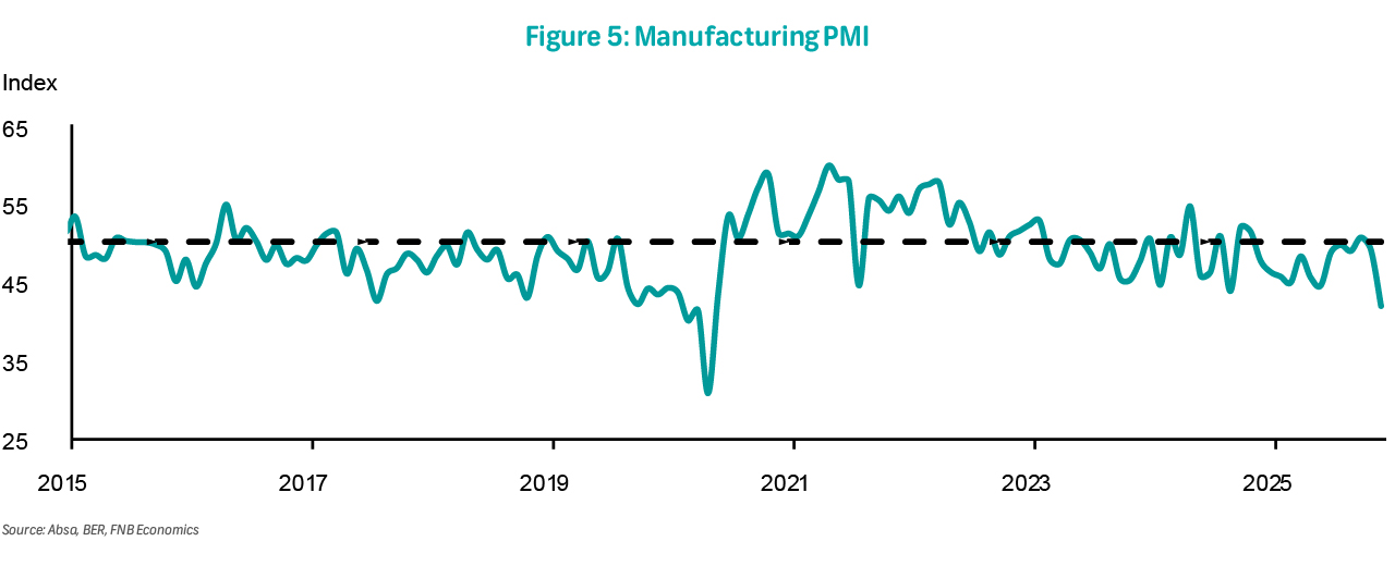 The Manufacturing PMI fell by 1.6 points to 49.2 points in October, continuing into contractionary territory. The outcome was driven by declines in four of the five headline PMI subcomponents, with employment being the only area showing slight improvement. Business activity saw a further drop, from 49.4 points in October to 36.7 in November. Even though the index has shown volatility, its sustained weakness is evident in the continued lack of momentum in official manufacturing data. Although a major drag on the headline PMI, the sharp drop in the supplier deliveries index could signal positive news if shorter delivery times reflect easing logistical constraints. The new sales orders index fell from 48.9 points in October to 35.6 in November. Export sales remained subdued, but the renewed decline in demand was primarily driven by the domestic economy. The employment index increased from 45.1 points in October to 46.2 in November. However, demand continues to be muted as activity remains volatile. More positively, the index tracking expected business conditions edged up to 50.8, signalling anticipated improvement in business conditions over the next six months.