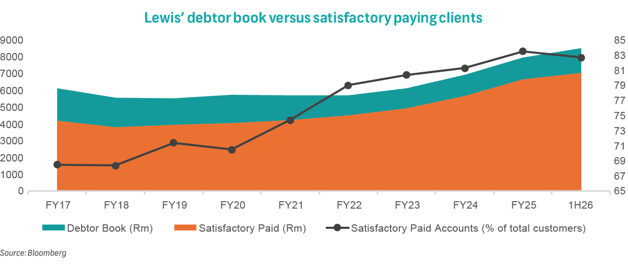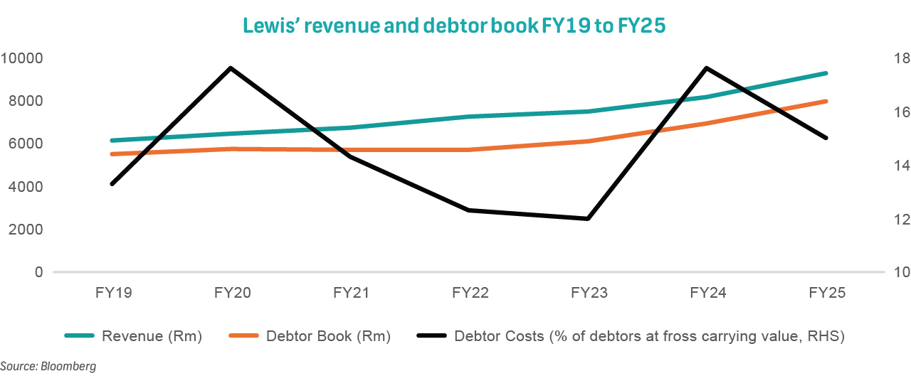 Since FY19 to the end of March, Lewis has managed to grow revenue by a 7.1% compounded annual growth rate (CAGR). This includes a slightly slower growth period during the Covid-19 period, and the commensurate recovery. In FY25, Lewis grew its top line by 13.5%. This slowed to 11.3% in 1H26 and 11.0% in 9M26 and was ascribed to pressure on consumer discretionary spending but helped by better credit sales growth.