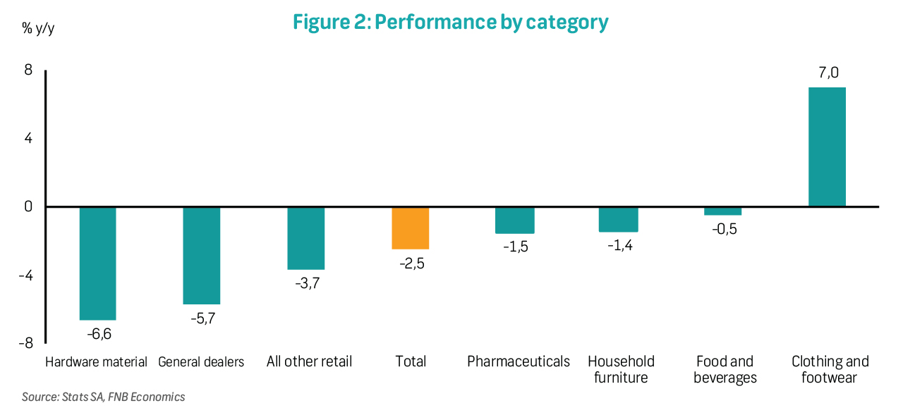 In line with our expectations, sentiment indicators point to subdued consumer demand in 4Q23. The FNB/BER Consumer Confidence Index edged slightly lower to -17 index points in 4Q23, from -16 in 3Q23, the lowest festive season reading in more than 20 years. In the same breath, sentiment among retailers, although improved from 32 to 47 in 4Q23, shows the uptick to be driven by improvements in profitability and general business conditions (on the back of less intense levels of load-shedding at the time of the survey), rather than improved sales growth. In fact, retailers of durable and non-durable goods reported lower sales volumes compared to the same period last year, while semi-durable goods retailers continued to see higher demand. Combined, these suggest that consumers, particularly in high- and mid-income segments, will be cautious during this holiday shopping season, which should worry retailers of non-essential goods. Overall, we maintain our view of subdued growth in household consumption expenditure for the short to medium term.