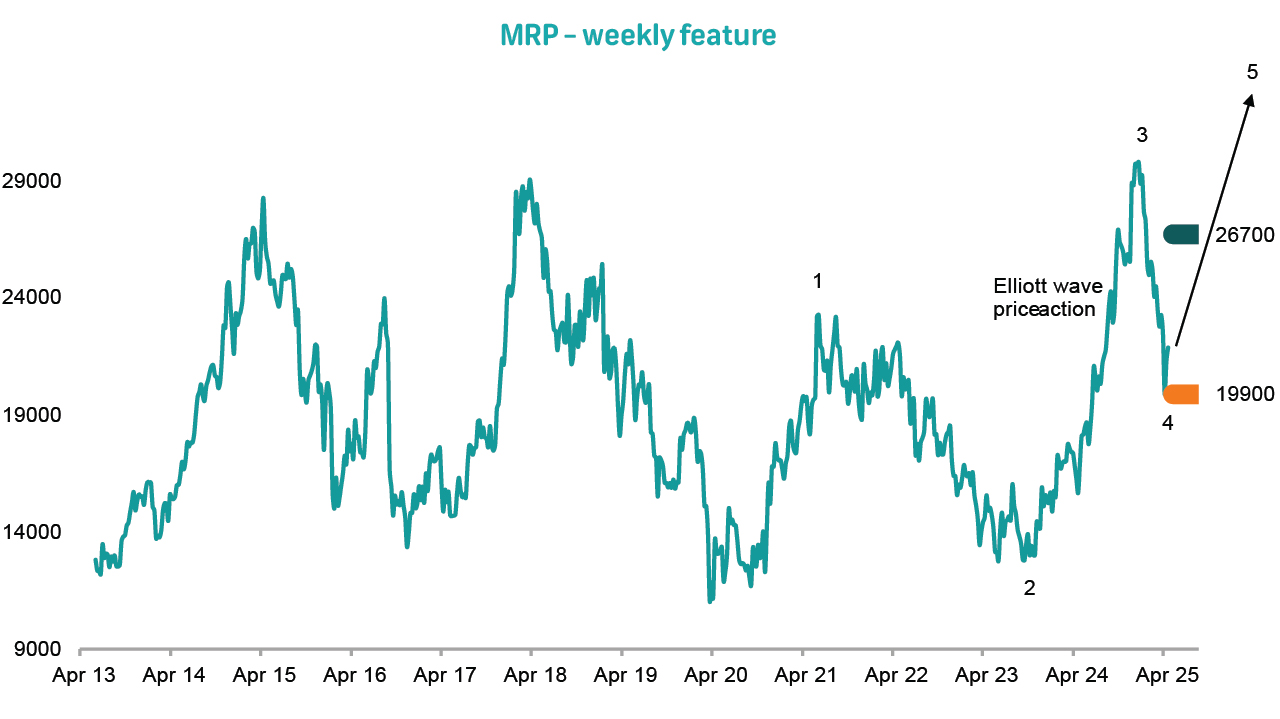 We maintain our profit target at R399.00 with a trailing stop-loss at R361.00. Exit the trade around 30 June 2025. |