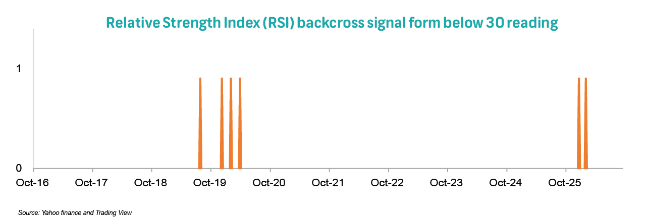 • The lower panel shows the occurrence of the Relative Strength Index (RSI) backcross signal from oversold territory (a reading of one indicates when such a backcross occurred). This bullish signal suggests that selling pressure has been exhausted and momentum is beginning to shift back to the upside.